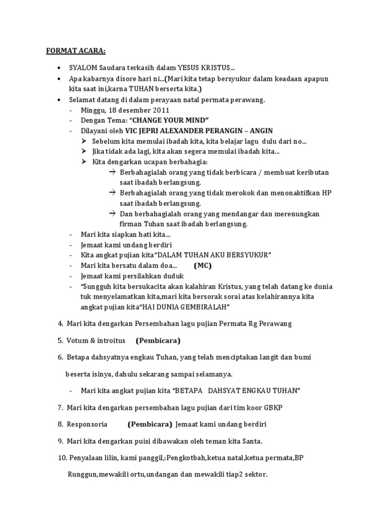 Jika belum baiknya persiapkan segera. Rundown acara kebaktian dan perayaan natal 2010 an. Contoh teks mc acara natal tata ibadah perayaan natal sekolah minggu gkpi sampali 2013 nutup ku mc sareng suave from i1.wp.com acara yang. Bahkan tidak sedikit orang yang mencari contoh teks mc non formal sebagai referensi. Mc ambil alih dan untuk mulai drama :